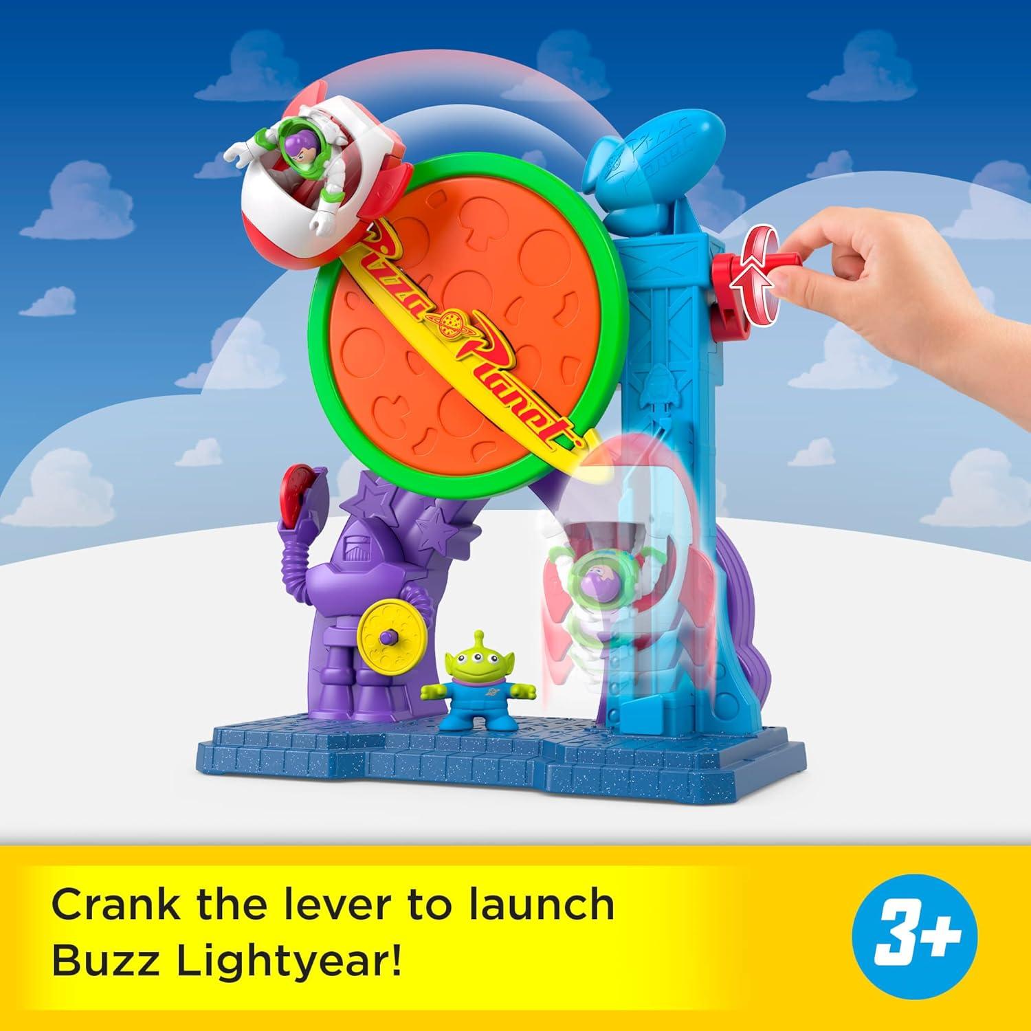 Inspired by Disney and Pixar Toy Story, young thrill seekers can dream up adventures to infinity and beyond with the Imaginext Pizza Planet Playset. Kids can take everyone's favorite space ranger on daring missions by putting the Buzz Lightyear action figure in his spaceship and cranking the lever! Fend off bad guys by serving up pizza projectiles with the Pizza Planet guard. And if Buzz needs back up, one of the little green men are up to the task! Colors and decorations may vary.
